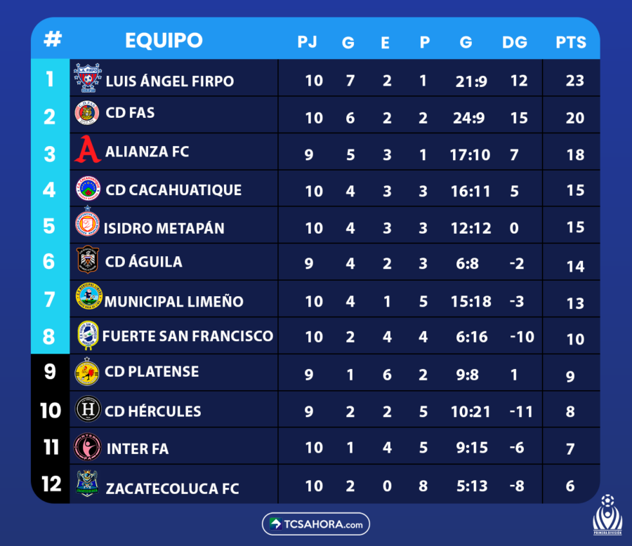Luis Ángel Firpo es el nuevo líder general de la competencia. Mientras que, Alianza sumó su cuarta victoria consecutiva en la fecha diez del Torneo Apertura 2025.