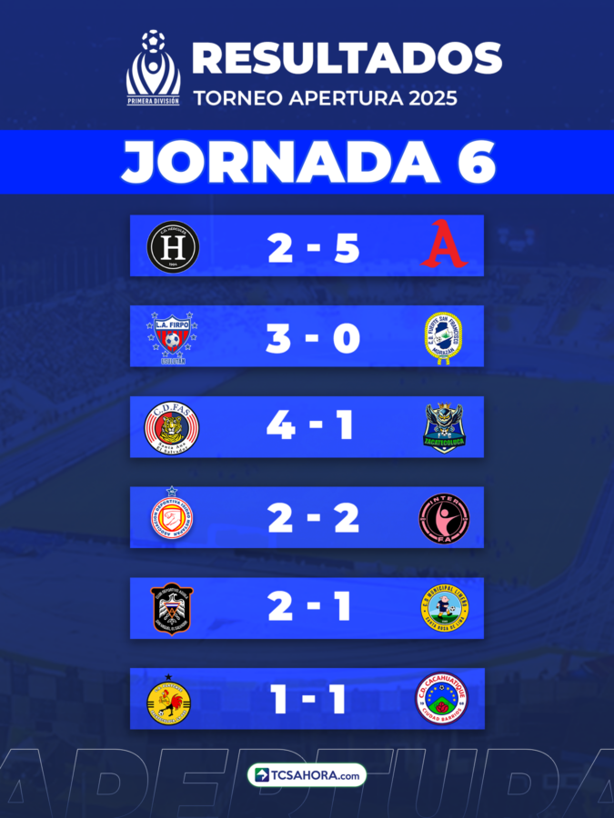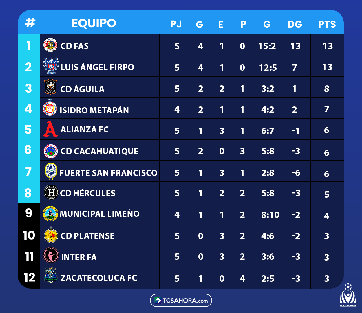 Club Deportivo FAS se mantiene como el líder general de la competencia, por diferencia de goles. Mientras que, Alianza y Águila volvieron en la fecha seis del Torneo Apertura 2025.