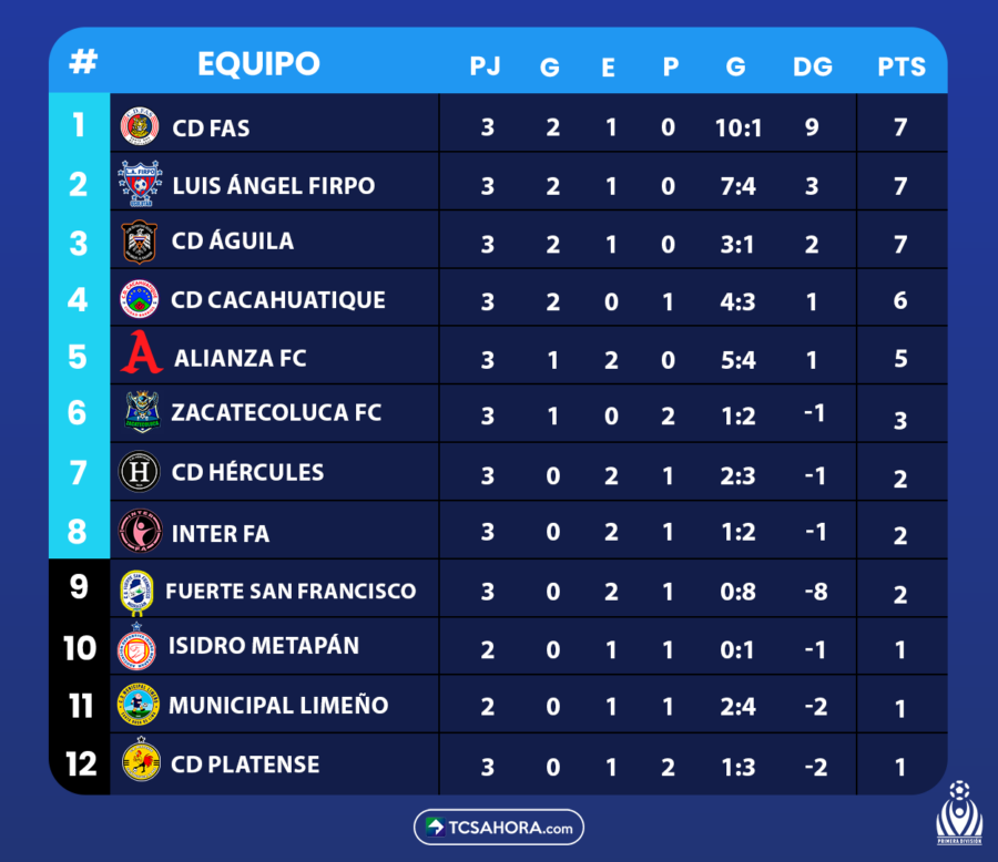 Club Deportivo FAS es el líder general de la competencia, por diferencia de goles. Mientras que, el campeón nacional, Alianza empató en una «lluvia de goles» ante Firpo en la fecha tres del Torneo Apertura 2025.
