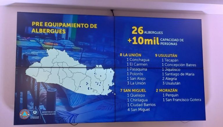 El director de Albergues, Josue García, comunicó que: «Desde la Dirección General de Albergues estamos coordinando esfuerzos con los Gobernadores Departamentales de San Miguel, Usulután, La Unión y Morazán, con el fin de brindar espacios que puedan ser utilizados como albergues preventivos».