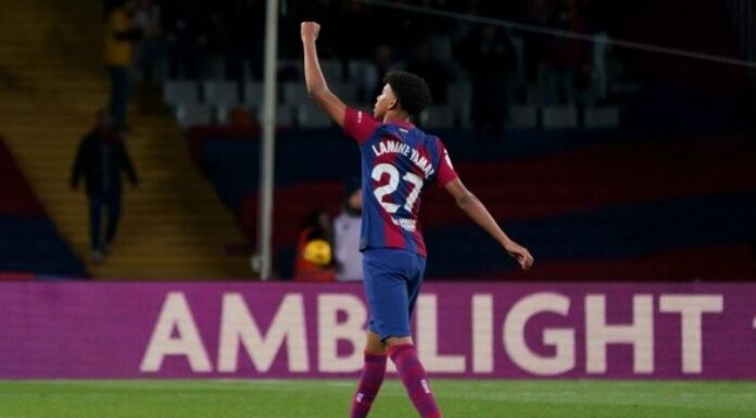 Al 80′, el incasable Yamal completó su brillante partido individual robando el esférico y sacando un misilazo afuera del área para emparejar los cartones.