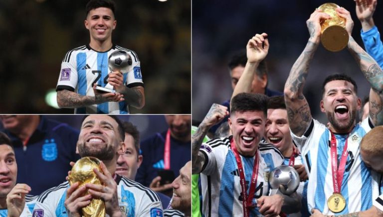 La nueva indumentaria tiene el nombre y el número, comúnmente utilizado, de Enzo Fernández (13) y de Nicolás Otamendi (30). Ambos coronados por lo más alto en este Mundial de Qatar 2022.