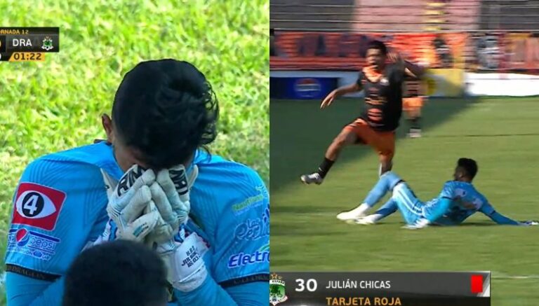 El derbi migueleño se complicó para Dragón luego que su portero se ganará la tarjeta roja en los últimos compases del primer tiempo. Con la mínima ventaja (1-0) a favor de Águila, Kevin Reyes se disponía a convertir su doblete tras recibir un pase largo cuando la barrida de Julián Chicas lo impactó y frenó su caminar al minuto 44.