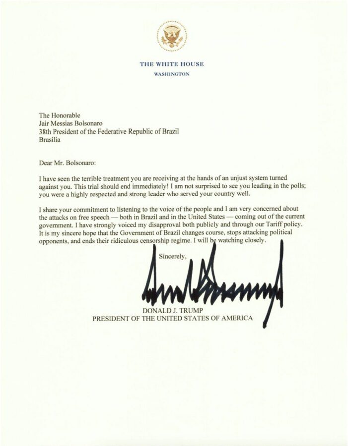 “He expresado firmemente mi desaprobación, tanto públicamente como a través de nuestra política arancelaria. Espero sinceramente que el gobierno de Brasil cambie de rumbo, deje de atacar a sus oponentes políticos y ponga fin a su ridículo régimen de censura”, añade la carta compartida por el mandatario estadounidense.