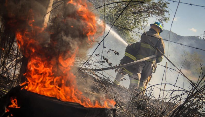 esta tarde Bomberos trabajan en la extinción de un incendio en terreno con maleza seca en el cantón El Tablón, municipio de El Paraíso, Chalatenango.