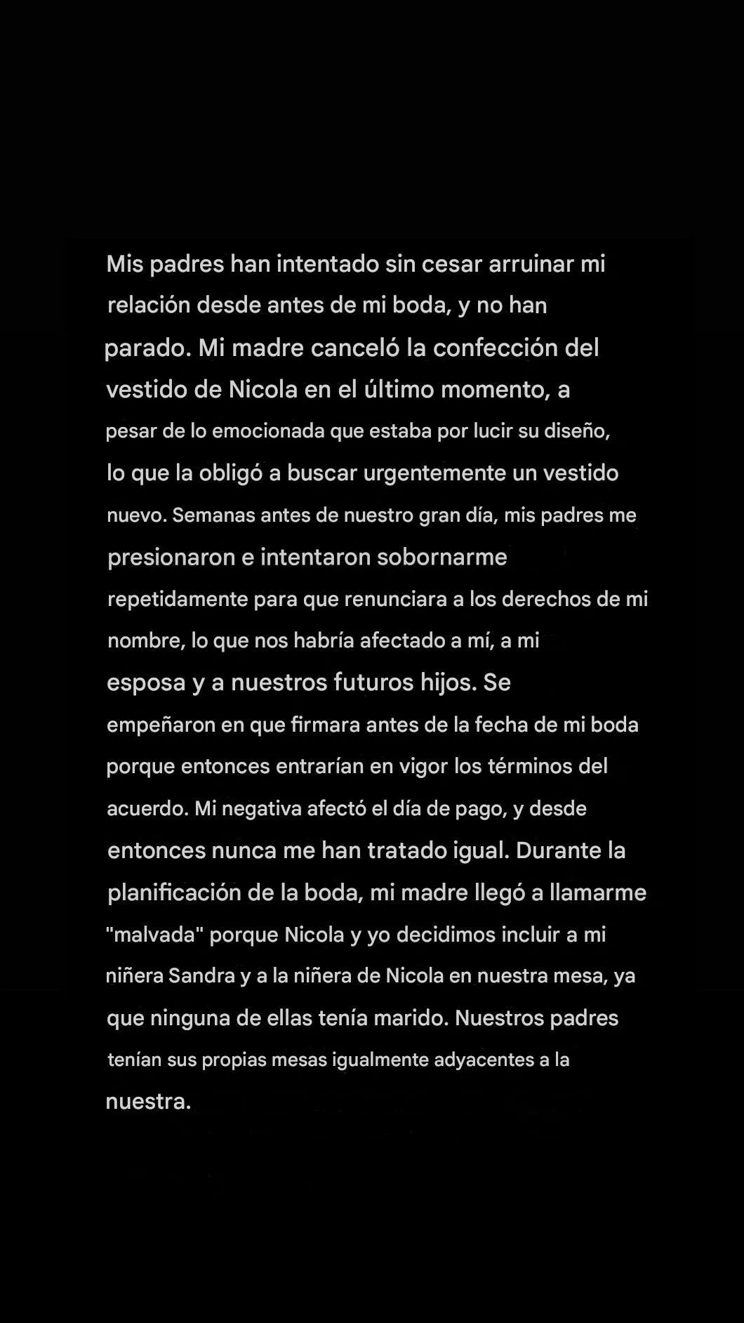 Uno de los momentos más duros que relató ocurrió en su boda. Aseguró que su madre interrumpió el baile planeado con Nicola y bailó con él frente a 500 invitados. “Nunca me he sentido más incómodo o humillado en toda mi vida”, afirmó.