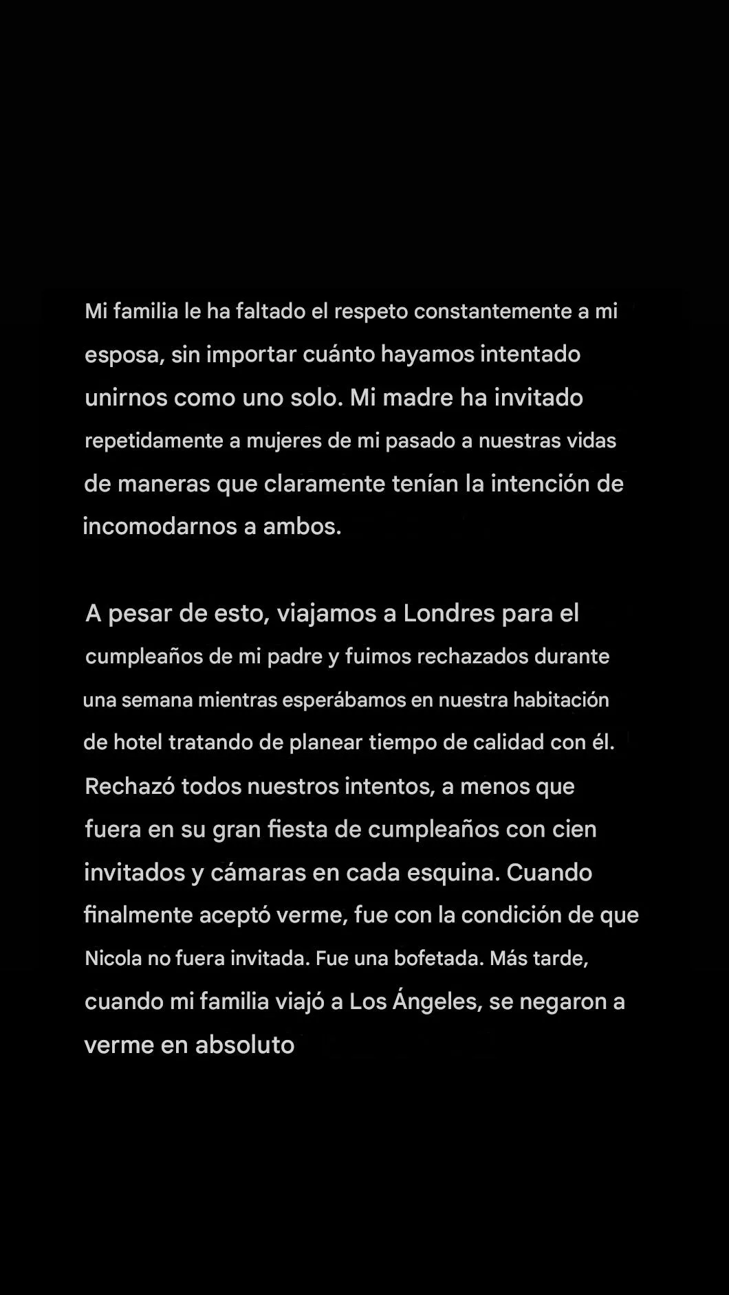 Sobre el cumpleaños 50 de su padre, contó que viajó a Londres, pero fue rechazado durante una semana. “Solo aceptaron verme si Nicola no estaba presente”, escribió.