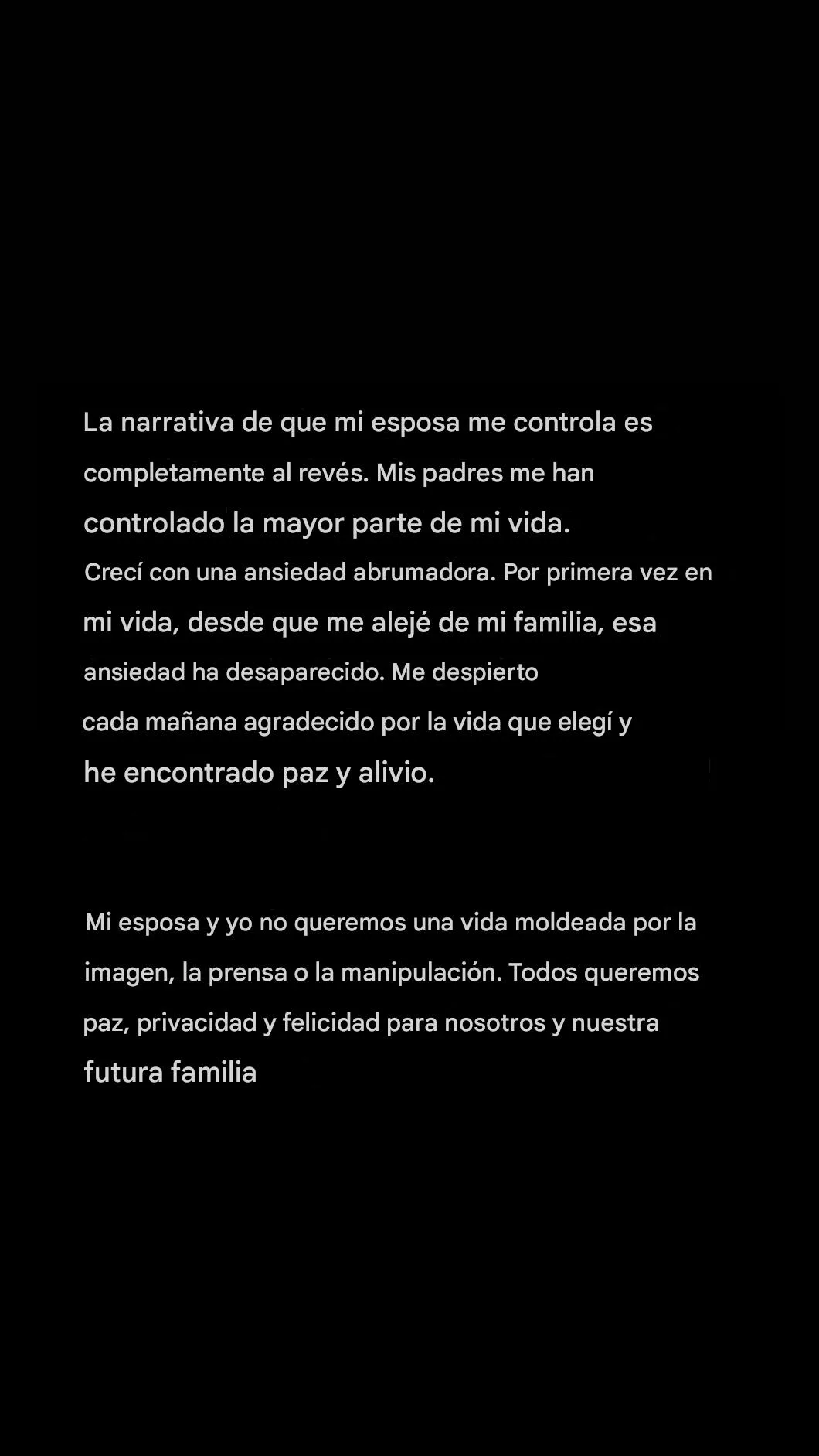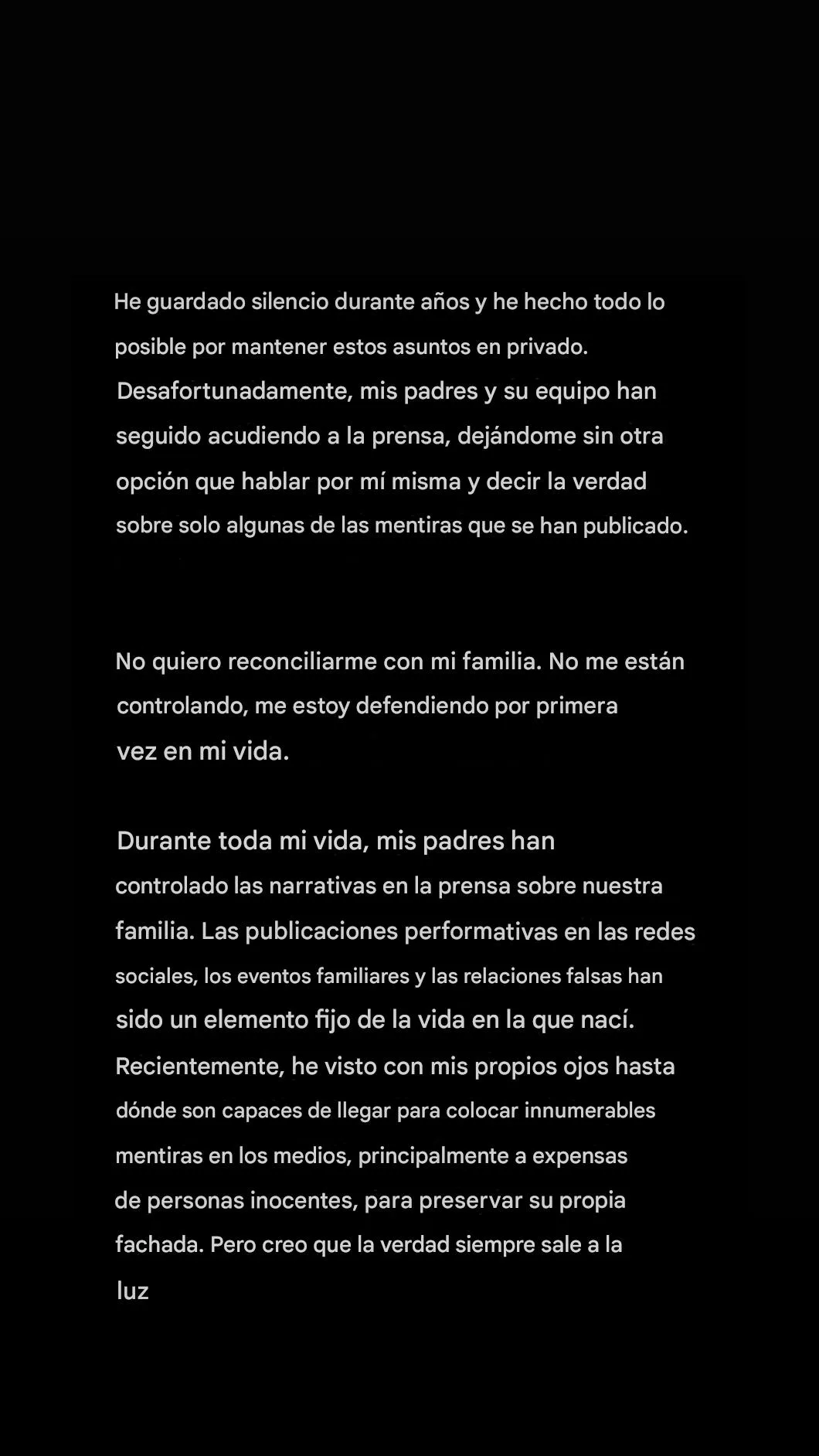 “He guardado silencio durante años y he hecho todo lo posible por mantener estos asuntos en privado. Mis padres y su equipo han seguido acudiendo a la prensa, dejándome sin otra opción que hablar y decir la verdad”, escribió.