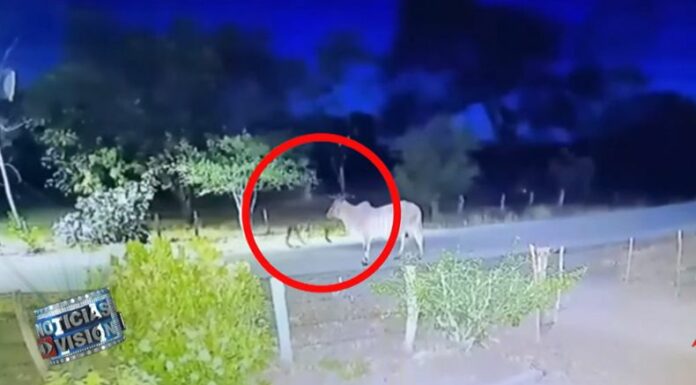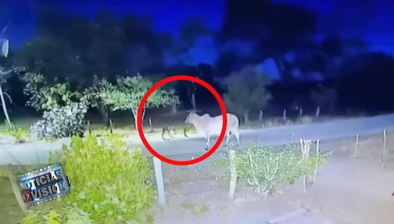 Como se ve en el metraje, una vaca se halla en medio de un camino durante la noche. Hay buena iluminación alrededor, por lo que la imagen se aprecia con claridad.