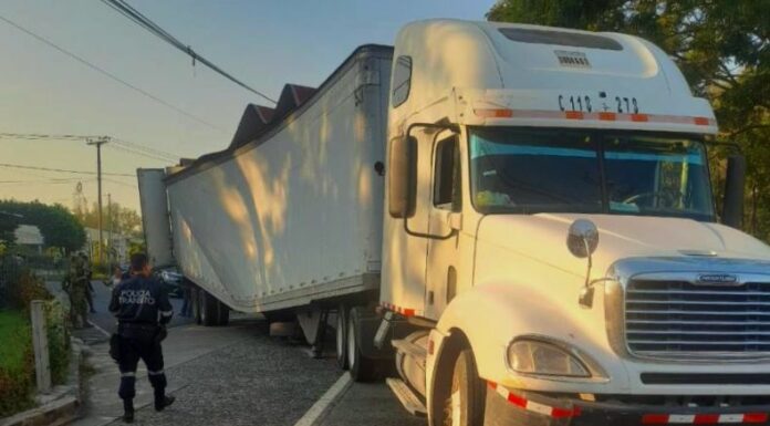 La policía Nacional Civil (PNC) reportó, a través de su cuenta de X, que el exceso de carga ocasionó que este furgón se desplomara del cabezal cuando salía de una fábrica en Olocuilta para incorporarse a la autopista a Comalapa.