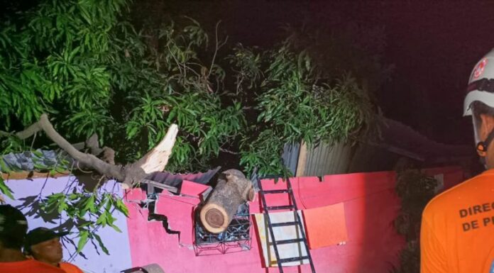 En horas de la tarde, elementos de Protección Civil realizó descopado de árbol que amenazaba con afectar vivienda y obstaculizar el paso en el Barrio Concepción, Santiago Texacuangos, San Salvador.