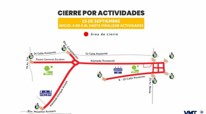 El cierre iniciará desde las 4:00 a. m. de este 15 de septiembre. El tramo del desfile principal en la capital será desde el sector de la plaza Divino Salvador del Mundo hacia el parque Cuscatlán, pasando por la Alameda Roosevelt.