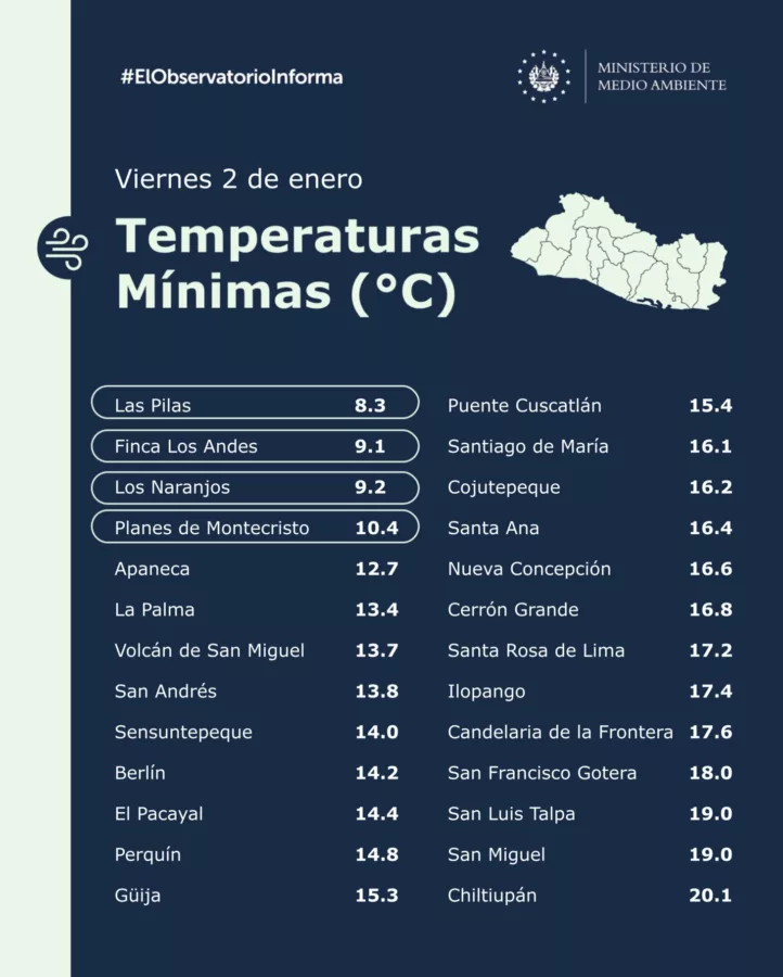 Mientras que en la Finca Los Andes, en Santa Ana, fue de 9.1 °; y, en Ilopango, San Salvador, fue de 17.4° Celsius.