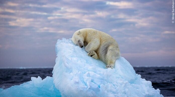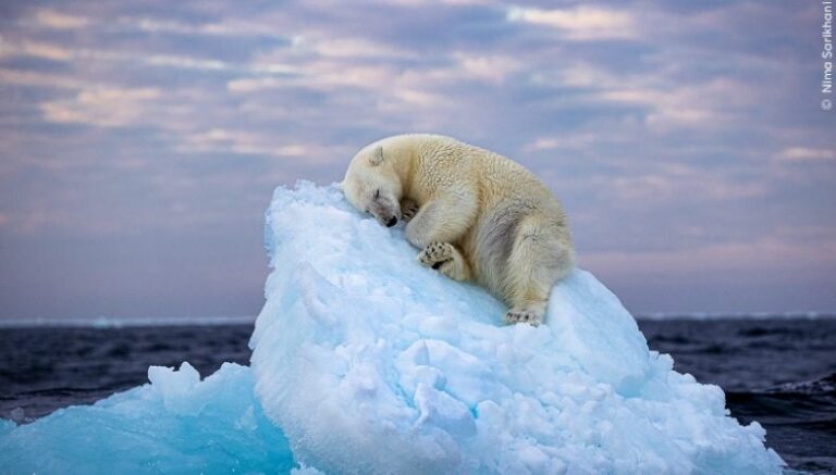 Una imagen vale más que mil palabras es la frase que muchos conocemos y en definitiva, esta es la fotografía que prueba como verdadero tal dicho. La conmovedora fotografía muestra a un oso polar tomando una siesta en lo que la autora llama una “Cama de Hielo”. Con un bello cielo rosáceo, podemos ver lo magnifica que la naturaleza es.