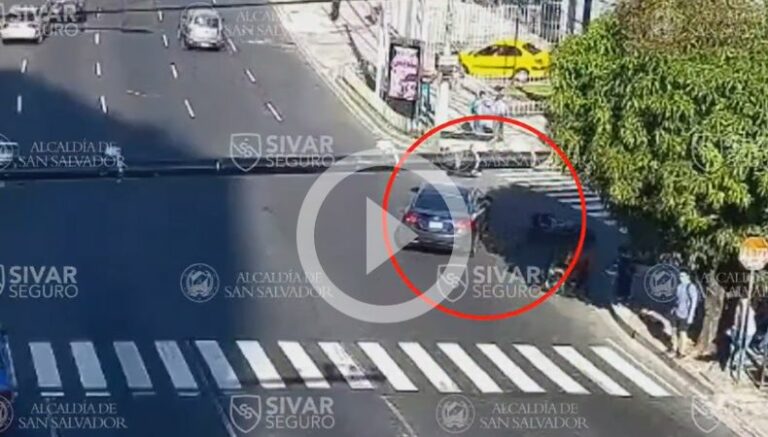 Las cámaras de Sivar Seguro de la alcaldía de San Salvador captaron este día un percance vial entre un vehículo tipo sedán y un motociclista, luego de que el vehículo realizará un giro imprudente hacia la derecha.