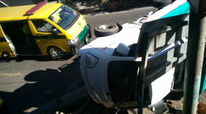 El hecho ocurrió en la carretera a Panchimalco, a la altura de la colonia San Antonio, en los Planes de Renderos. La versión preliminar ha determinado que la conductora de un vehículo invadió el carril, provocando que un camión volcara en la calle.