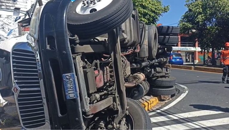 Un camión de carga volcó este día entre la intersección de la avenida Masferrer Norte y la Séptima calle poniente en San Salvador.