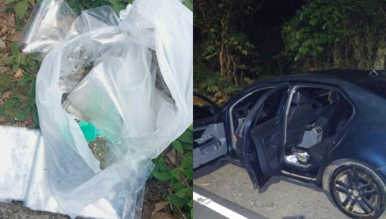 En la bolsa que lanzaron se encontraron 60 porciones de droga entre marihuana, cocaína y metanfetamina, además de una balanza digital. Mientras que, en el registro del vehículo se incautaron: porciones de marihuana, dinero en efectivo, una pipa, dos celulares.