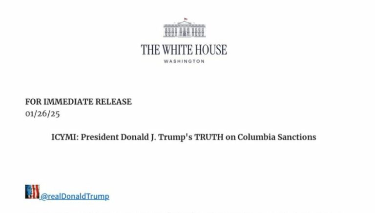 “Mensaje del presidente Donald J. Trump en Truth Social sobre las sanciones a «Columbia»”, escribió la Casa Blanca en un correo de prensa para compartir el anuncio que hizo el republicano en esa red social. Dicho término, sumado a las sanciones comerciales, marcó un nuevo punto de tensión en las relaciones entre ambas naciones, que enfrentaban desafíos en temas como migración, comercio y seguridad regional.