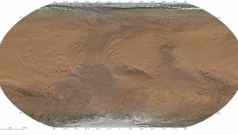 La Administración Nacional del Espacio de China (CNSA por sus siglas en inglés) divulgó imágenes globales panorámicas a color de la superficie de Marte, en un mapa capturado por la misión enviada por ese mismo país en 2020, Tianwen-1, que incluyó un orbitador, y un rover (Zhurong), que recorre el Planeta Rojo.
