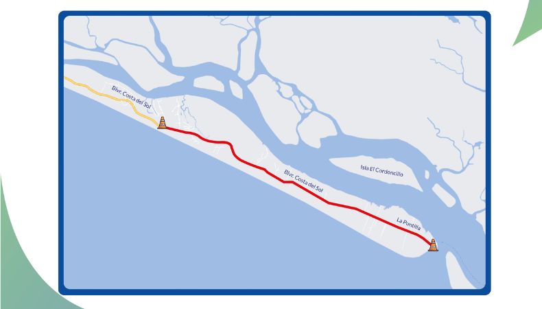 Jueves 6 de julio de 7:00 a. m. a 9:30 a. m. se realizará reconocimiento de ruta en el bulevar Costa del Sol, desde La Puntilla hasta un reconocido restaurante de la zona. Se tendrá un cierre total de ambos carriles y todas sus intersecciones.