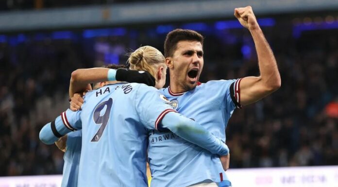 Los dirigidos por Pep Guardiola se adelantaron en el marcador en los primeros minutos. Rodri abrió la lata tras realizar un formidable testarazo al 4′ (1-0).