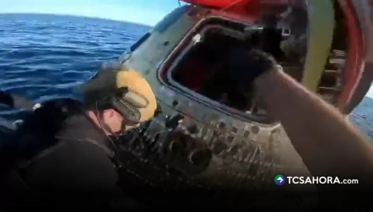 Las imágenes captaron la llegada de buzos y embarcaciones especializadas que se acercaron a la cápsula para estabilizarla. Minutos después, el equipo trabajó en abrir y verificar la nave, en un proceso que forma parte del protocolo tras su impacto en el agua.