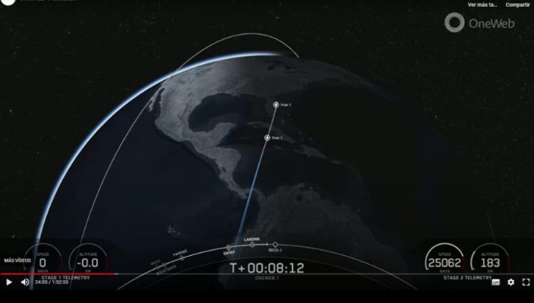 El cohete Falcon despegó al atardecer con 40 minisatélites con destino a la órbita polar. Con ellos, la constelación de OneWeb se ampliará hasta superar los 500 satélites, casi el 80% del total previsto de unos 630 indicó la compañía dueña del cohete.