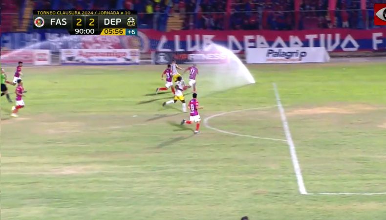 El duelo de FAS vs. 11 Deportivo, celebrado en el ‘Quiteño’ fue interrumpido justo cuando la visita controlaba el balón en el centro del campo y encaraba hacia el campo contrario, cuando los aspersores empezaron a funcionar. Este particular hecho tuvo lugar en el tiempo agregado, al 90+6′, y con el marcador empatado, 2-2.