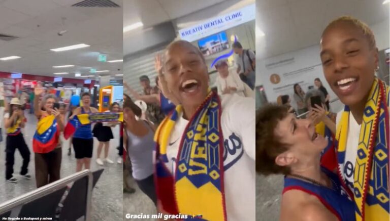 Unos venezolanos arropó a la plusmarquista en el aeropuerto con un ambiente lleno de color. Tras su arribo, el grupo bailó y entonó canciones como “Venezuela”.