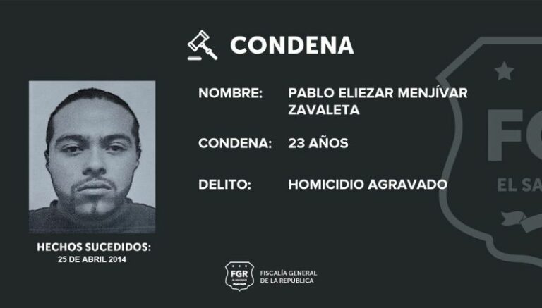 La condena la impuso el Tribunal de Sentencia de Cojutepeque en ausencia, debido a las reformas del Código Procesal Penal. Además, la FGR informó que los demás pandilleros que participaron en este homicidio, ya cumplen sus condenas por este delito cometido.