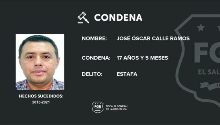 Por medio de su cuenta oficial de X, la Fiscalía General de la República (FGR) informó que un hombre, identificado como José Óscar Calles Ramos, recibió una condena de 17 años y 5 meses por estafar a siete personas a quienes les prometió terrenos en San Juan Opico.