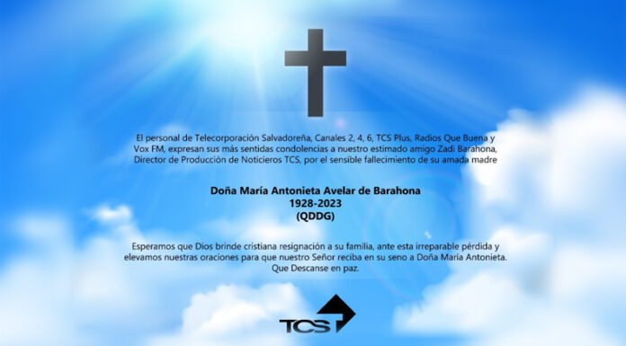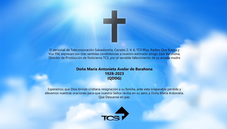 TCS Ahora se une a las condolencias por el sensible fallecimiento de doña María Antonieta Avelar de Barahona, madre de nuestro estimado amigo Zadi Barahona, director de Producción de Noticieros TCS. Extendemos nuestra compañía a toda su familia.