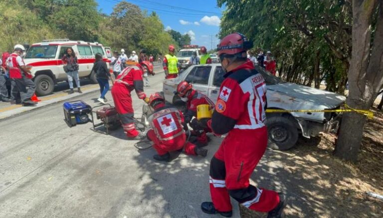 Socorristas con especialidad en atención prehospitalaria y personal de la Unidad de Rescate Vehicular, de Cruz Roja Salvadoreña (CRS), realizaron un simulacro de accidente vial en el kilómetro 9 de la carretera a Comalapa, por el monumento Cristo de La Paz.