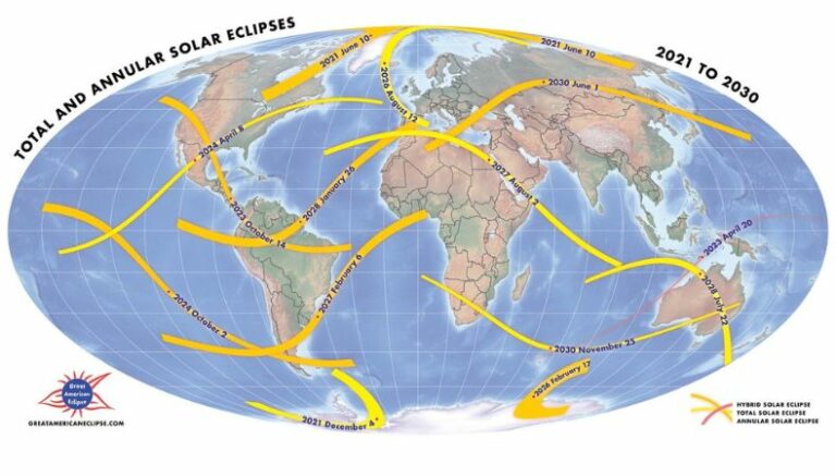 Además, el portal consideró importante destacar aquellos eclipses anulares que también serán presentes en toda esta década (Desde 2021 hasta 2030). La leyenda destaca que, las rayas de color amarillo intensos representan aquellos eclipses solares totales, mientras que las líneas naranjas, son los anulares.