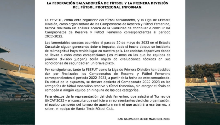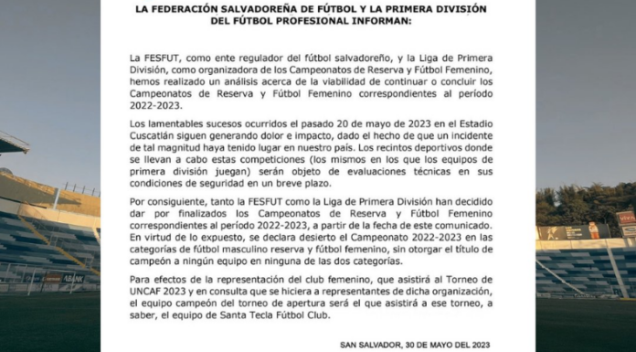 En un comunicado de prensa, la FESFUT y la Primera División informaron que el Torneo de Reserva y el fútbol femenino se dan por finalizados.
