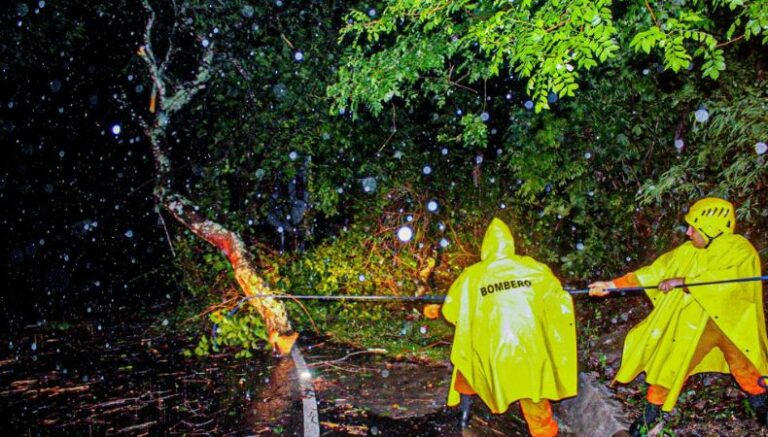 En otro punto, luego de las lluvias, Cuerpo de Bomberos realiza maniobras para retirar un árbol caído, debido a las lluvias en el sector puente La Joya, en el río Tamulasco, entre el desvío hacia el municipio de Las Vueltas y al cantón Guarjila, Chalatenango.