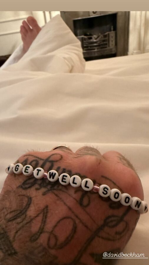 La noticia se conoció luego de que su esposa, Victoria Beckham, publicara en redes sociales una serie de fotografías donde se le ve en una cama de hospital con un cabestrillo azul. Acompañando la imagen, la diseñadora escribió un mensaje de ánimo: «Ponte bien pronto papi», junto a una pulsera con la misma frase.
