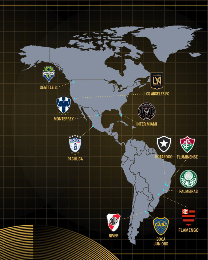 - Por CONCACAF: Monterrey (México), Seattle Sounders (Estados Unidos), Pachuca (México), Inter Miami (Estados Unidos) y Los Angeles FC (Estados Unidos).