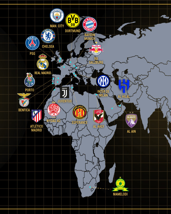 - De África: Al Ahly (Egipto), Wydad Casablanca (Marruecos), ES Tunis (Túnez), Mamelodi Sundowns (Sudáfrica).