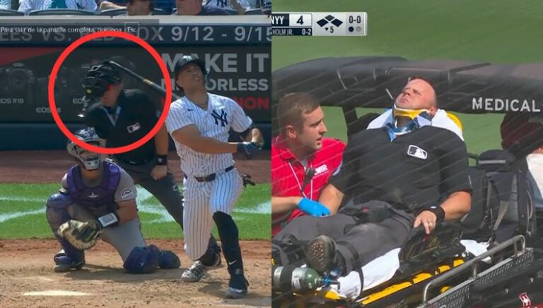 Un momento de terror se vivió este domingo en el Yankee Stadium durante el partido entre el equipo de New York y el Colorado Rockies. El árbitro Nick Mahrley fue retirado del engramillado luego que parte del bate de Giancarlo Stanton le impactara en el rostro y parte del cuello.