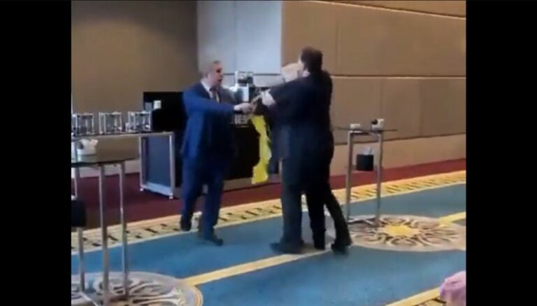 Durante el altercado en el pasillo del parlamento, Marikovski recupera la bandera empujando al hombre en la cara.