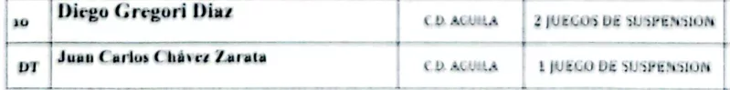 El futbolista de Club Deportivo Águila, Diego Gregori Diaz, así como el técnico mexicano Juan Carlos Chávez recibieron dos y un juego respectivamente.