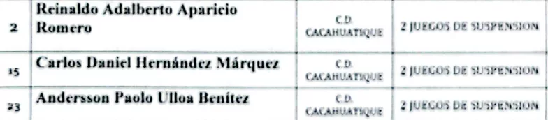 Además, los futbolistas Reinaldo Aparicio, Daniel Márquez y Paolo Ulloa de CD Cacahuatique recibieron dos juegos de sanción tras ser expulsados en la vuelta de las semifinales ante Alianza FC el 13 de diciembre.
