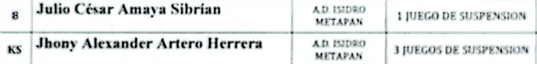 Finalmente, Julio Amaya y Jhony Herrera de Isidro Metapán recibieron uno y tres juegos de sanción respectivamente.