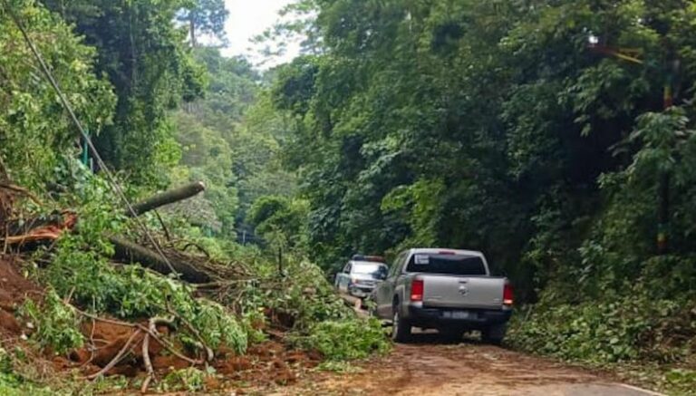 Obstrucción en la carretera. Así se encuentra el panorama en la calle que de Santa Ana conduce a Sonsonate, a la altura de Chalchuapa, luego de que unos árboles se desplomaran e impidieran el paso en la zona, tanto para personas como conductores.