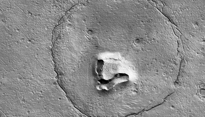 La cámara de alta resolución HiRISE, de la Universidad de Arizona de Estados Unidos, opera en la misión Mars Reconnaissance Orbiter (MRO) de la NASA, y encontró una figura familiar formada sobre la superficie de Marte, cuando orbitaba el planeta a 251 kilómetros de altura. Se observa la cara de un oso asomándose desde el planeta rojo.