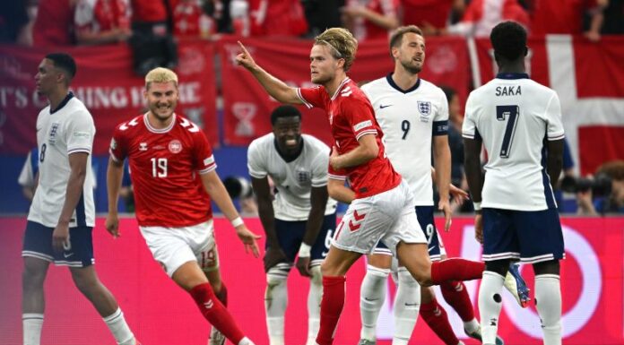 Lejos de intimidarse, los daneses fortalecieron sus líneas y no tardaron en transgredir las redes rivales. Al 34′, Hjulmand con un remate lejano igualó los cartones.