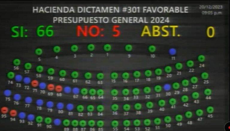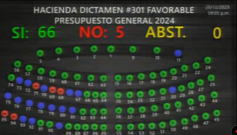 Con 67 votos a favor, uno a mano alzada, diputados de la Asamblea Legislativa aprobaron esta noche la Ley de Presupuesto General del Estado, Presupuestos Especiales y Ley de Salarios para el año 2024, el cual asciende a $9,068.7 millones, lo que significa un incremento de 166.1 millones con respecto al ejercicio fiscal de 2023.