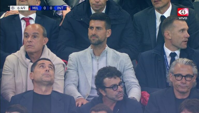 Más de 75 mil asistentes en San Siro presenciaron la victoria del Inter (2-0) en contra del Milán por la ida de semifinales de la Champions League (otros tantos lo hicieron por el «tradición en deportes» 😉). Entre los cuales se encontraban muchas célebres figuras de ambos equipo, pero una de las que llamó la atención fue Novak Djokovic, quien fue visto en uno de los palcos VIP del recinto, al lado del mítico futbolista Andrei Shevchenko.